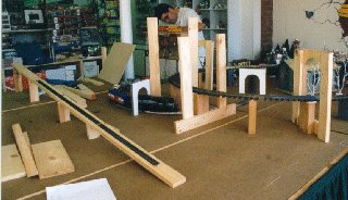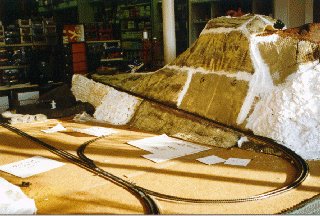 "Beach Cities Junction" "Beach Cities Junction" is the center of attention at Ron's World. The layout has been a project for Ron and the members of his Tuesday night layout class. The "Beach Cities Junction" layout is unique in that most layouts don't accomodate 3 different gauges of trains in a single setting, "G", "O" and "HO". At Ron's World we have worked hard on integrating the 3 guages and making sure that things look right when we did so. Below is a pictorial history of how we went about creating the layout, and some discussion about the materials used. All of the materials that we used were taken directly from Ron's World. Should you have any questions about the materials, on their use, or how to purchase them, contact Ron by email, or by phone (714) 361-5596. To give you some basic idea of how we started, we built our table, and established a position for a control desk that would allow us to see the whole layout from a single positon. When we started, the majority of the "G" gauge layout was already completed by Ron, but the class needed to do some alternate routing to the engine house, and some wiring. Probably the largest challenge was to create this layout, but still keep the effort under control. After all, the layout is in a fully functional business establishment. We always had Ron letting us know that "Hey guys.....I've still got a business to run, keep it clean!" So needless to say, we had to carefully plan how we were going to proceed: do a little bit of work each week, and make sure it all ran for the customers the rest of the time.