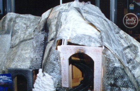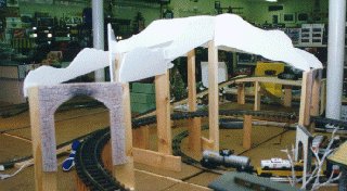 First, our Heisler could handle the grade even with a tender and several log cars attached. We were skeptical at first, but our little engine seemed to be able to handle almost anything we could throw at it. The second reason for increasing the slope was to have the elevation finish at a point where we could integrate our waterfall and still keep things looking good. Now that the supports were in place, we could start attaching the portals for the "G" gauge, and the foam core supports for the top of our mountain. Moira, the artist of our group, helped us create the foam core cutouts. She made sure that the cutouts were attached securely with a hot glue gun to the top of the wooden supports, and that they looked like a real mountain landscape would. This is the beginning stage for our mountain to begin taking shape in order to support the geodesic foam sheets that we would be using to form the actual body of the mountain.