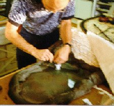 From what we could tell, Bragdon did a great job with the molds as well. Using the resin to create the rock is a two step process. The first resin sets up hard right away, and you have to add a foaming resin to the backside to give it a little more substance. However, once you lift it out of the mold, it is flexible and cuttable just like the foam sheets. HINT: When using this process to bring rocks right up to an edge, use the resins very sparingly, and you will get nice thin edges that make a nice gradual transition of the rock to another surface. Just be careful pulling them out of the mold; being so thin they have a tendancy to tear.